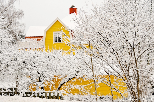 Ooh, this almost makes me want snow, hehehe. That yellow house is so fantastic surrounded by white.