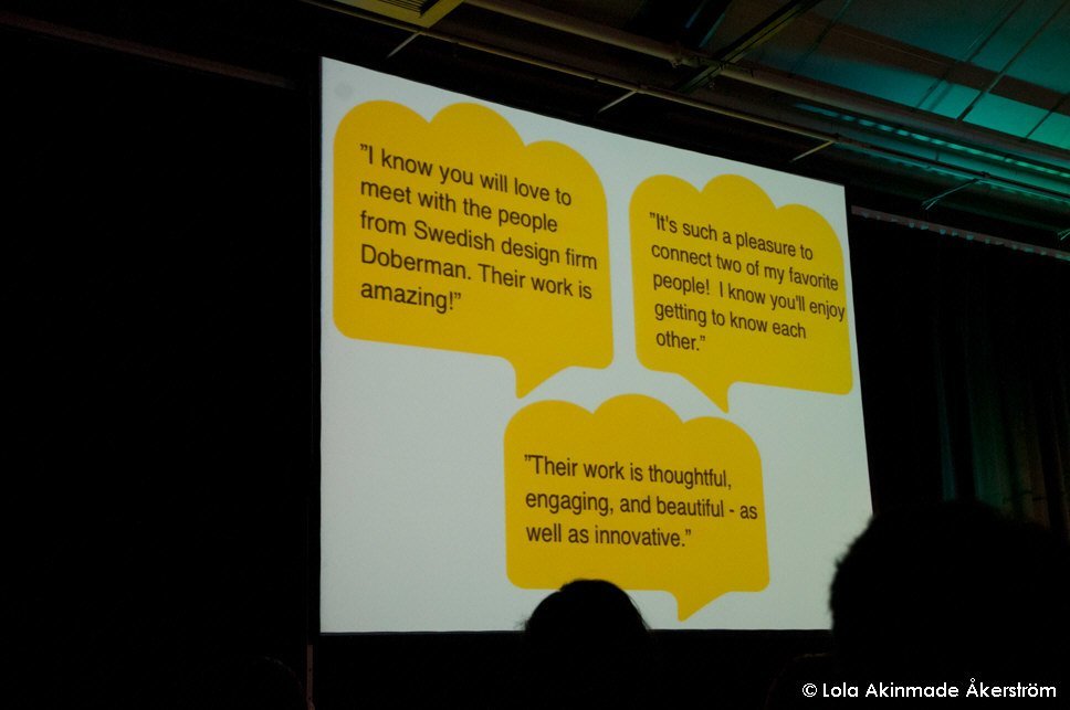 I thought it was an insightful point when Lisa Lindström of design firm Doberman mentioned that, when trying to enter a new market, since Sweden was already known around the world for design, they didn’t have to focus as much energy on introducing themselves as a “design” firm but rather, focused that energy on showing the client how they were going to solve their problem. Because “Swedish design” is a trusted cultural brand, they could ride on the coattails of that common knowledge.